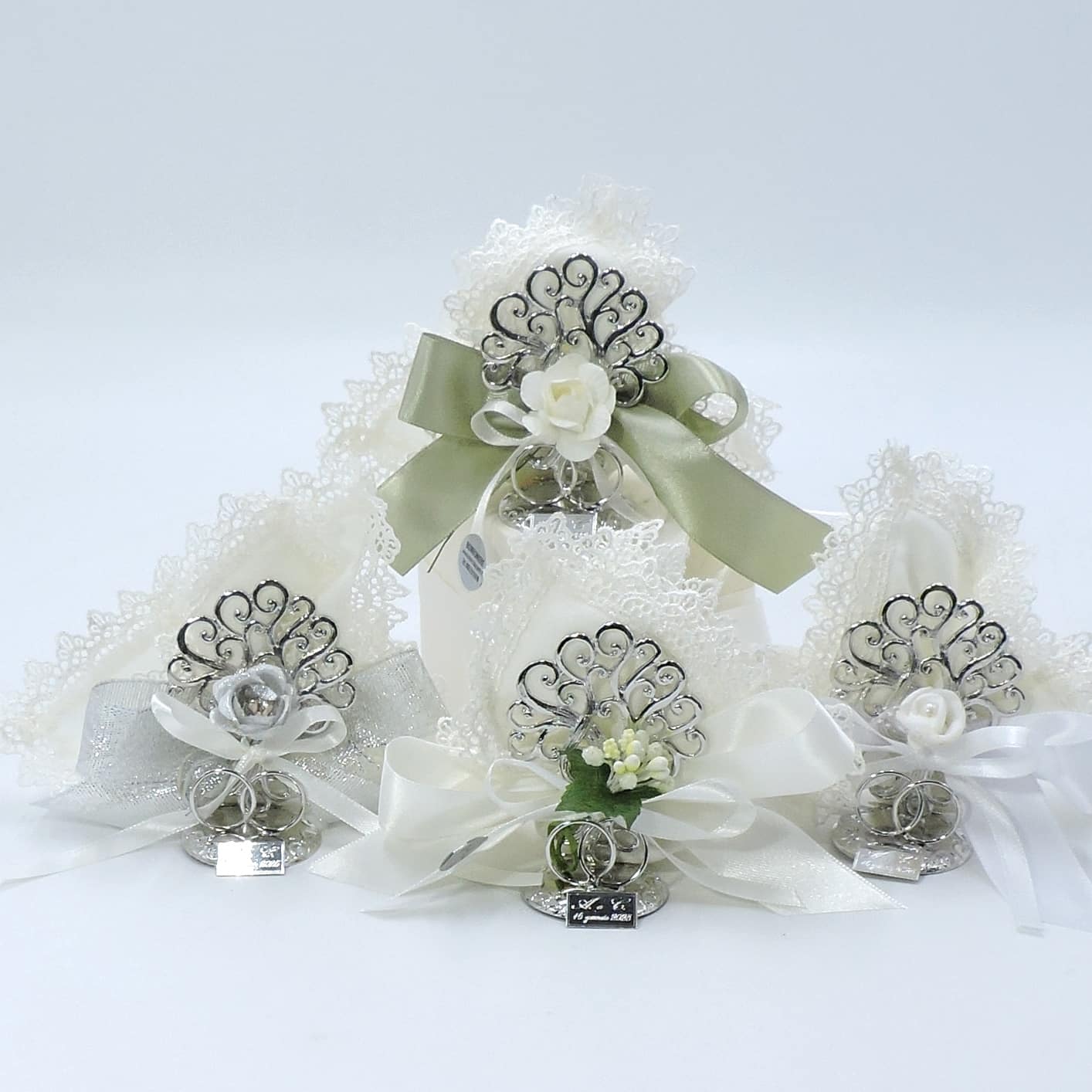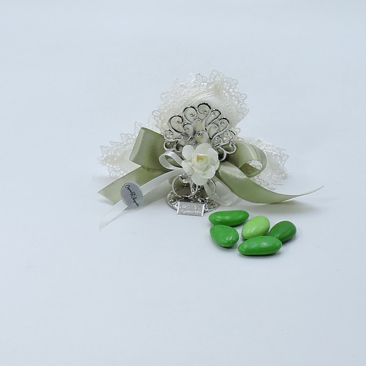 L’albero della vita è confezionato con fazzoletto color avorio rifinito con pizzo con 5 confetti di ottima qualità, nastri in raso e fiori. Puoi ricevere la bomboniera con o senza scatola singola che sarà chiusa con nastro del colore scelto.