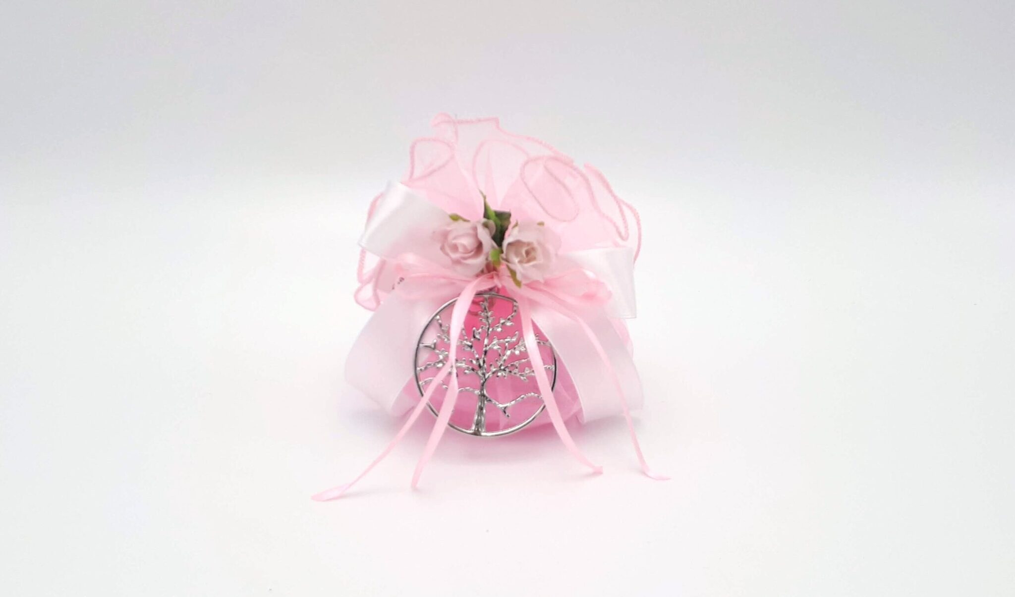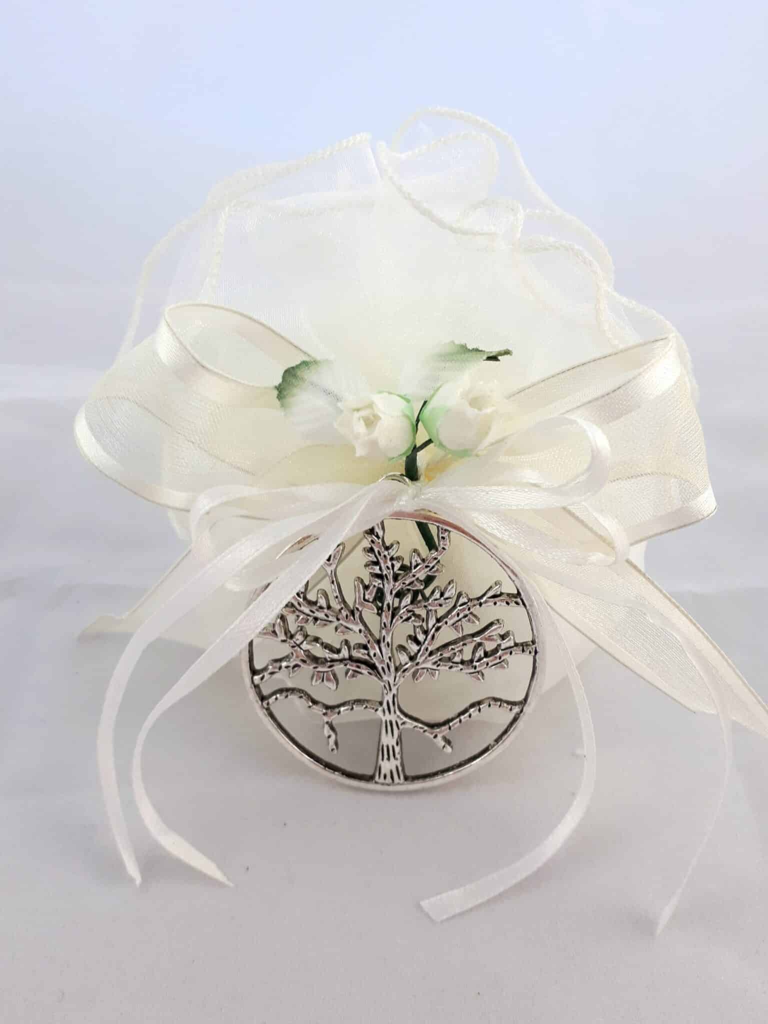 con ciondolo Albero della vita in lamina d’argento confezionato con sacchettino in organza con 5 confetti, nastri in raso e fiori.