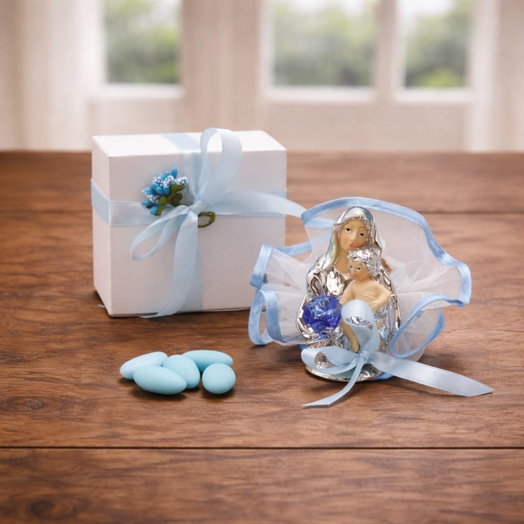 Bomboniera battesimo bambino con maternità e fiore in vetro soffiato color azzurro con 5 confetti di ottima qualità e con certificato di garanzia della lavorazione artigianale. ALTEZZA 9 CM.