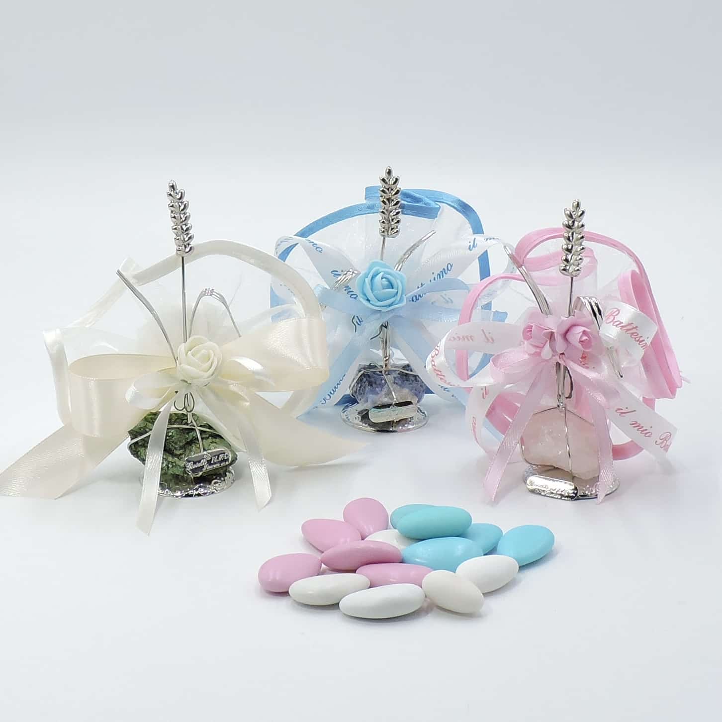 Bomboniera battesimo con spiga su pietra minerale a scelta realizzata a mano in lamina d’argento. La bomboniera con spiga è completa di 5 ottimi confetti e certificato di garanzia della lavorazione a mano.