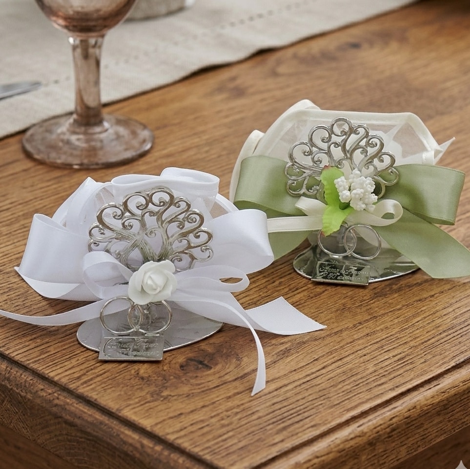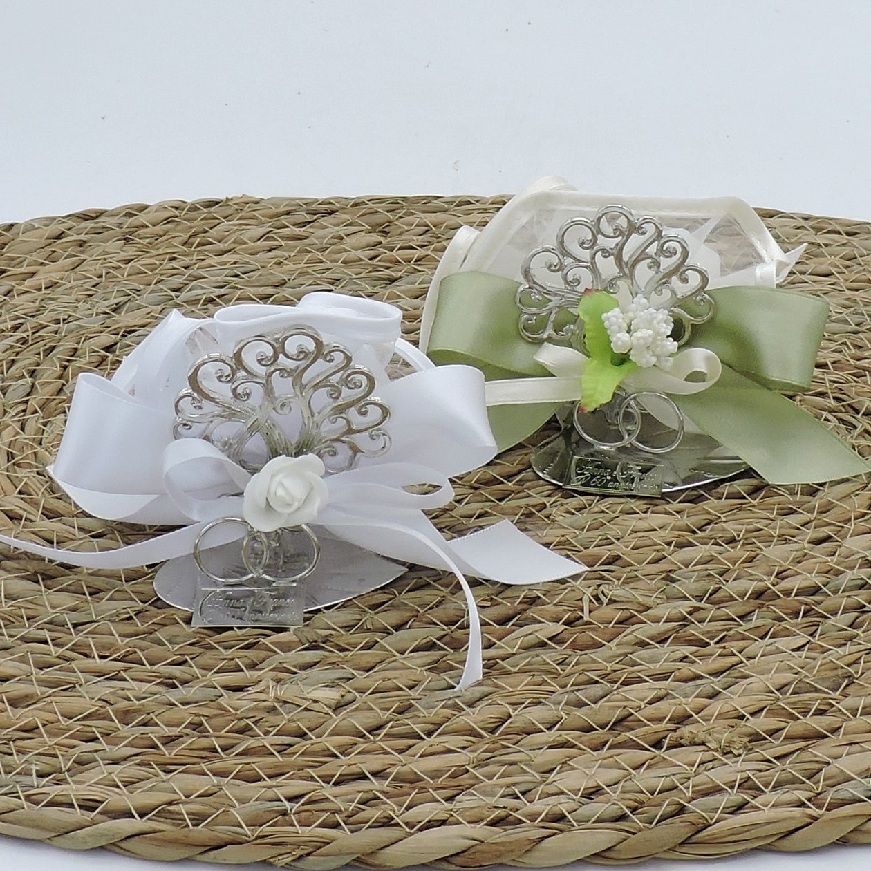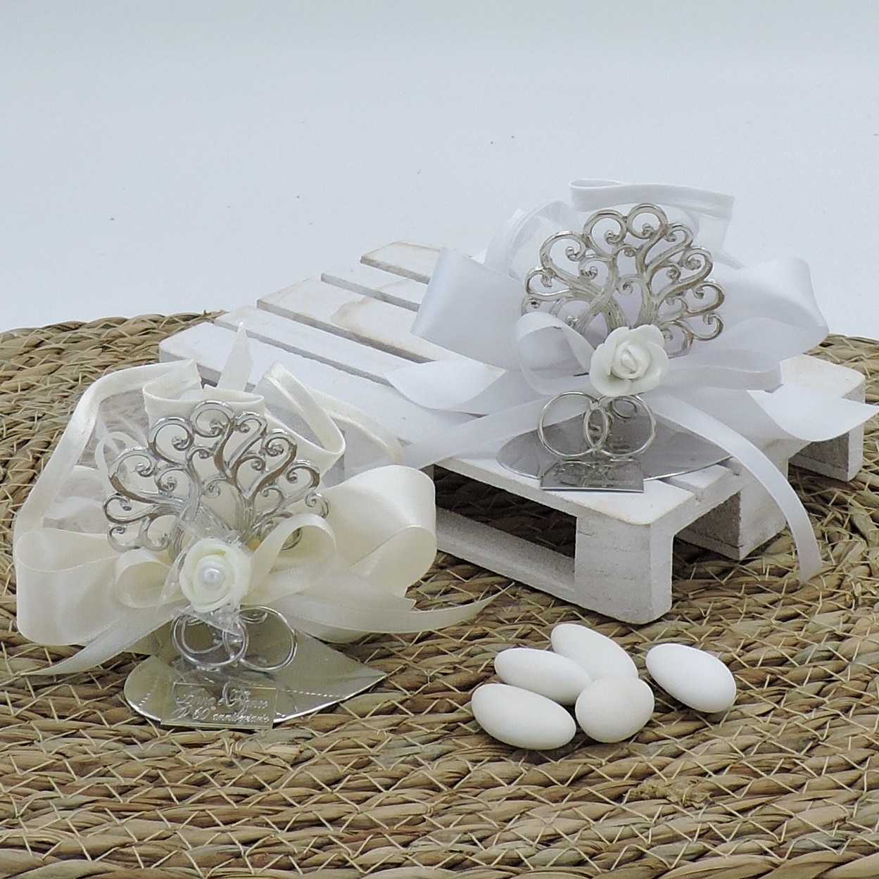 Bomboniera con albero della vita, fedi e incisione personale realizzata in lamina d’argento. L’albero della vita con fedi è fatto a mano e presenta sul davanti una targhetta sulla quale è possibile incidere nomi e data.