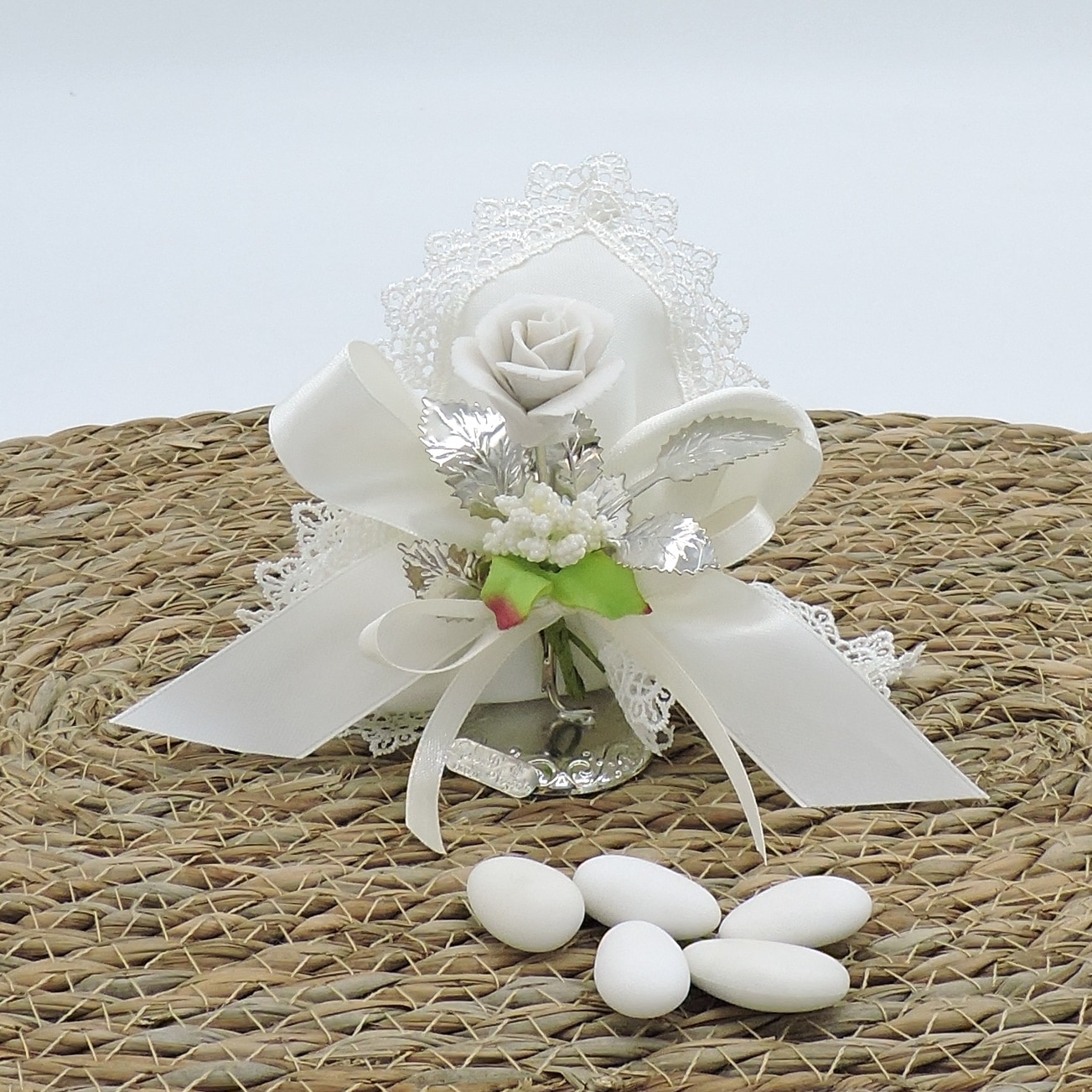 Bomboniera con rosa di porcellana bianca e lamina d’argento fatta a mano con 5 confetti di ottima qualità in fazzoletto avorio rifinito in pizzo accompagnata dal certificato di garanzia della lavorazione artigianale. La bomboniera è rifinita con nastri e fiori a scelta. Puoi decidere se ricevere la bomboniera con rosa in scatola singola color avorio con nastro di chiusura.