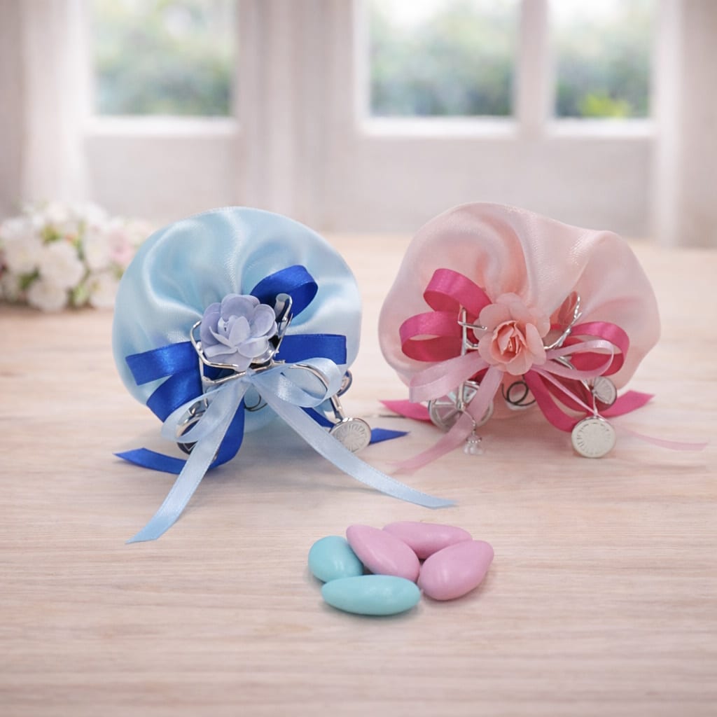 La bomboniera è realizzata con coccarda in raso con colore a scelta e puoi personalizzare la confezione scegliendo il colore dei nastri e fiori e se ricevere la bomboniera con o senza scatola singola. Il colore del nastro di chiusura della scatola e del fiore sono in linea con le opzioni scelte. I fiori possono essere diversi ma simili secondo la disponibilità.