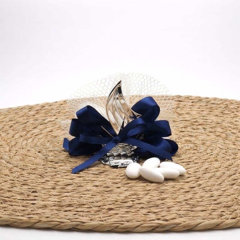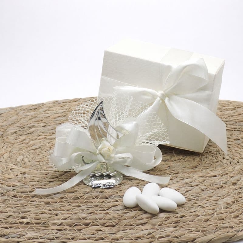 La vela in lamina d’argento sullo scafo in cristallo trasparente è arricchita dal portaconfetti a rete che richiama il tema mare a cui è ispirato la bomboniera. I 5 confetti classici simbolo di salute, felicità e ricchezza sono del colore a scelta, sia alla mandorla classica che cioccolato. I nastri i raso completano la composizione con eleganza e semplicità. Può essere completata da una scatolina avorio coordinata diventando un dono perfetto da dare a parenti e amici in un giorno così speciale.