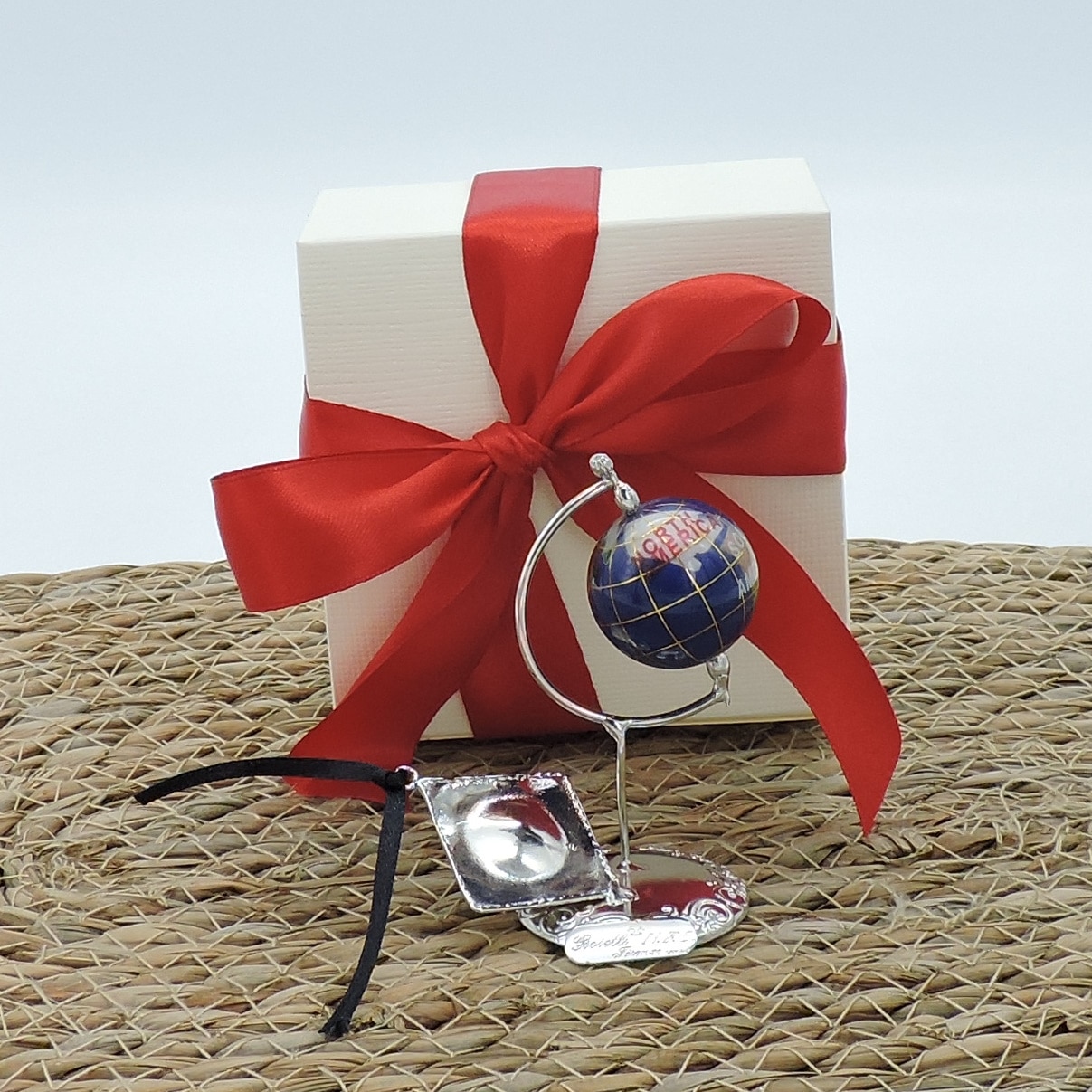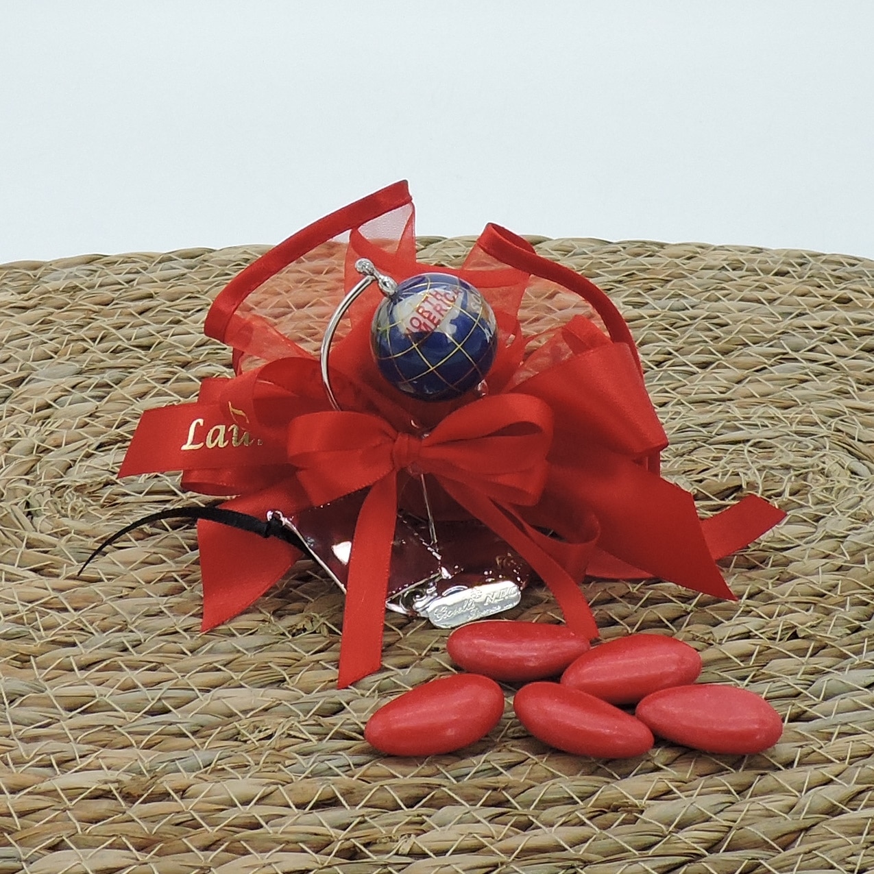 La confezione è realizzata con tulle rosso rifinito in raso e nastri, con 5 ottimi confetti a scelta. La bomboniera può essere completa di scatola avorio chiusa con nastro in raso. Ogni mappamondo è accompagnato dal certificato di garanzia della lavorazione artigianale.