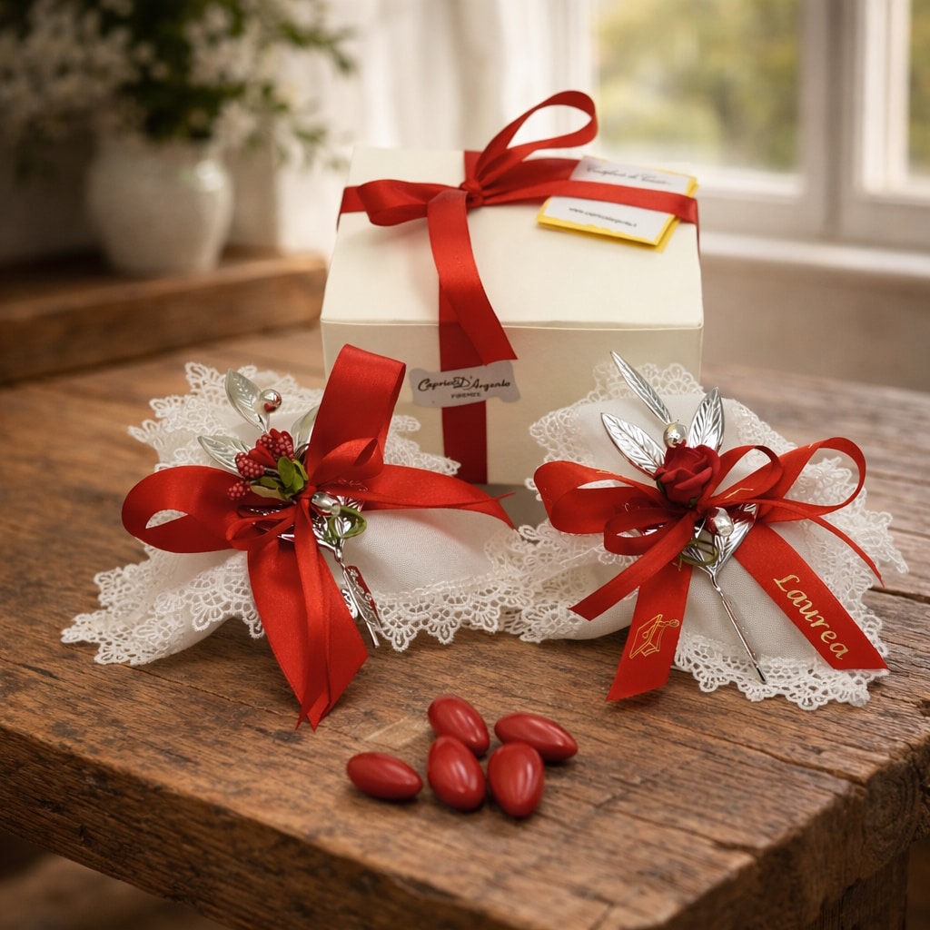 Puoi scegliere il colore dei nastri e fiori e gusto dei confetti. Puoi inoltre ricevere la bomboniera con o senza scatola. Il colore del nastro di chiusura della scatola e del fiore sono in linea con le opzioni scelte. I fiori possono essere diversi ma simili secondo la disponibilità e possono variare nel numero secondo le dimensioni.