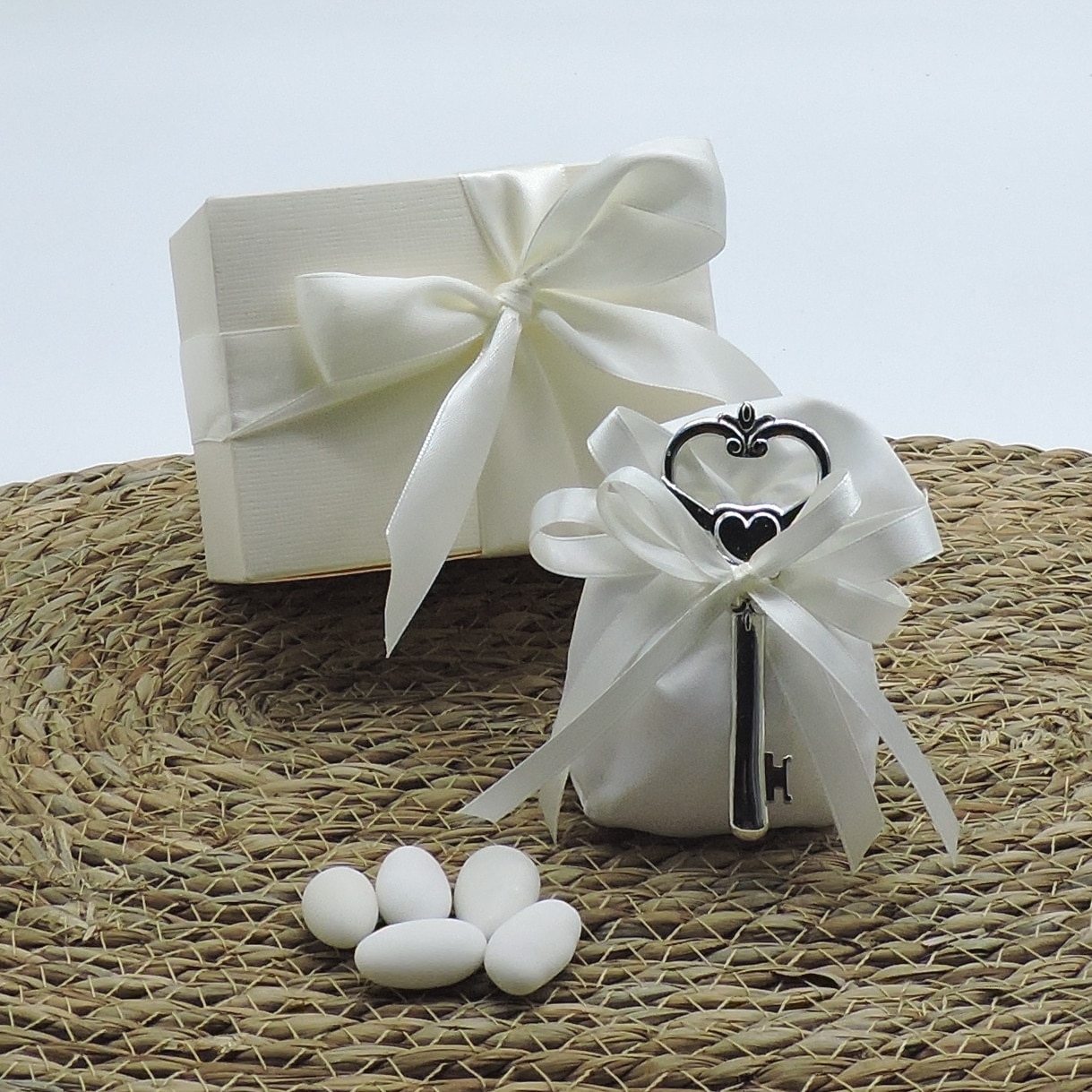 Bomboniera matrimonio cavatappi a forma di chiave con cuore confezionata con sacchetto in raso con 5 confetti a scelta, la bomboniera utile è completa di certificato di garanzia della lavorazione artigianale.
