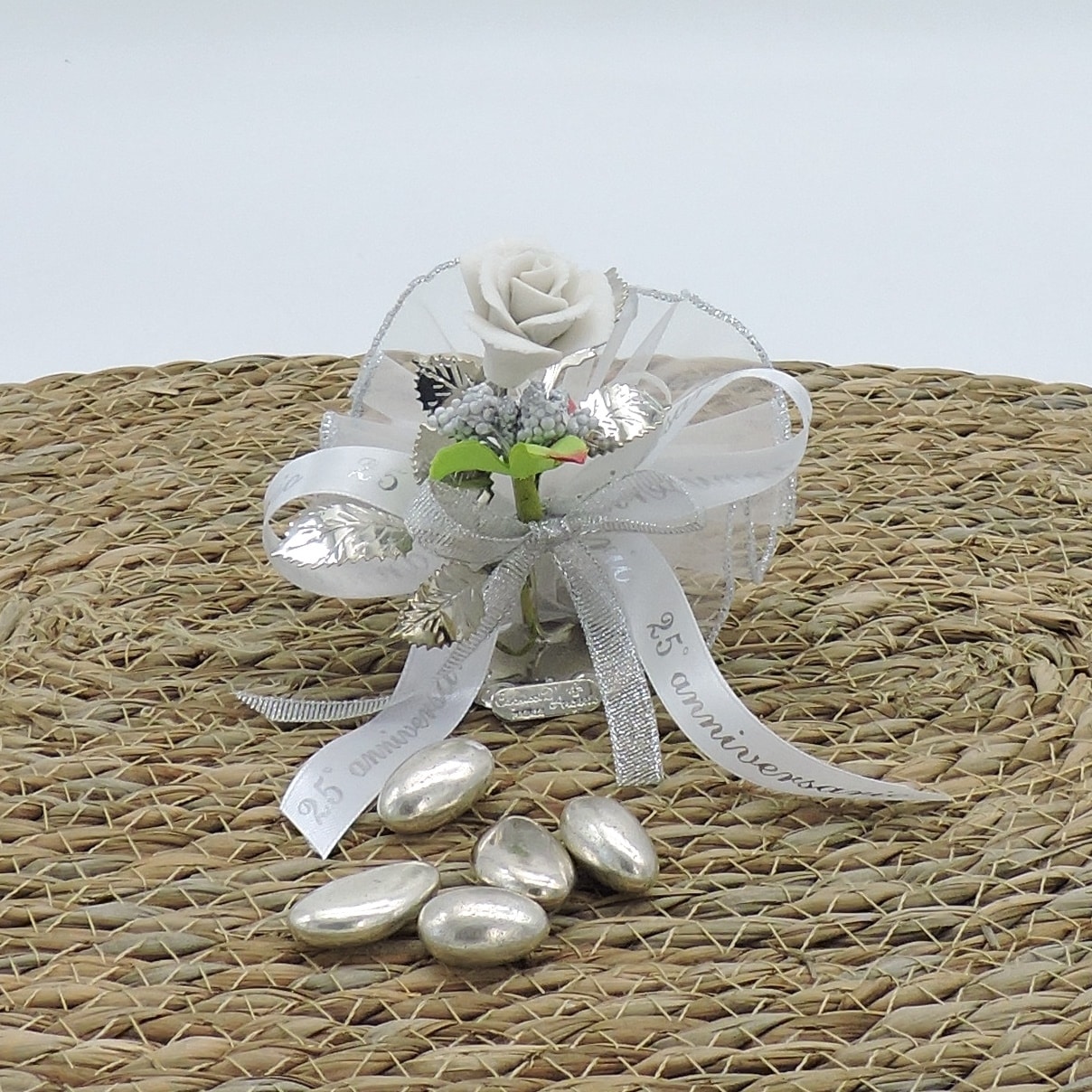 Bomboniera nozze d’argento con rosa in porcellana bianca e lamina d’argento realizzata a mano. La bomboniera con rosa è confezionata con velo rifinito in lamé argento con 5 ottimi confetti e nastri a scelta. Puoi decidere se ricevere la bomboniera in scatola avorio chiusa con nastro.