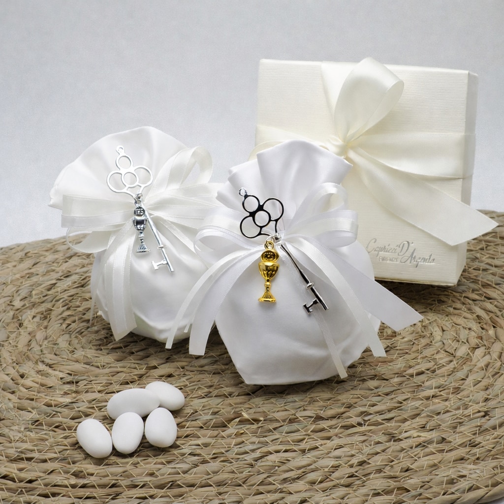 Una bomboniera Prima Comunione simbolica e raffinata, pensata per celebrare la questo importante giorno con eleganza e significato. Il simbolo della chiave, emblema di apertura e fiducia, con il calice, segno profondo del sacramento e della fede, completata un elegante sacchetto in raso bianco.