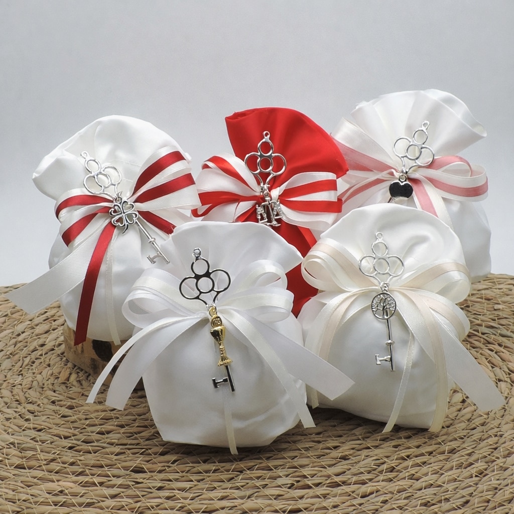 Il sacchetto e i nastri in raso sono disponibili in diversi colori a scelta, per adattarsi perfettamente allo stile dell’evento. Possibilità di scegliere il charm personalizzato con un soggetto diverso dal calice.