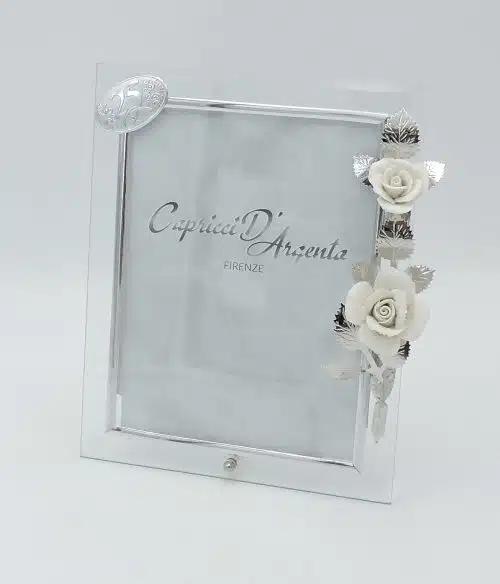 Cornice vetro ed argento con rose bianche 15×20 cm