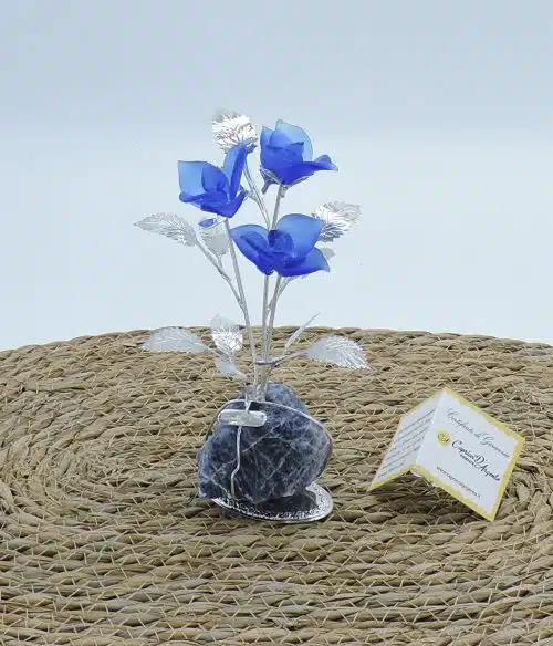 Rosa blu in argento e vetro satinato su pietra minerale blu, realizzata artigianalmente
