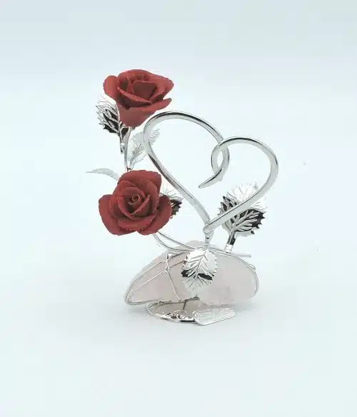 Rose rosse in porcellana e argento con cuore su quarzo rosa
