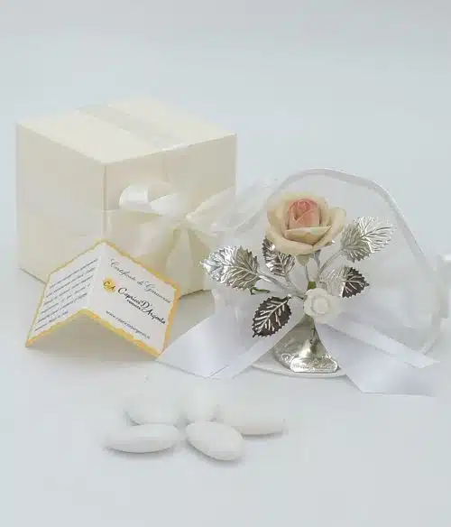 Bomboniera nozze di diamante con rosa porcellana e argento