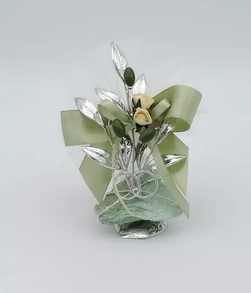 Bomboniera nozze di smeraldo con olivo e incisione a scelta