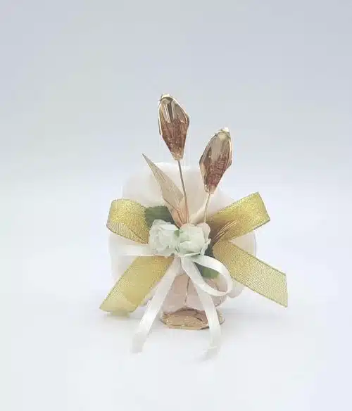 Bomboniera nozze oro con sacchetto in organza e rosa in raso