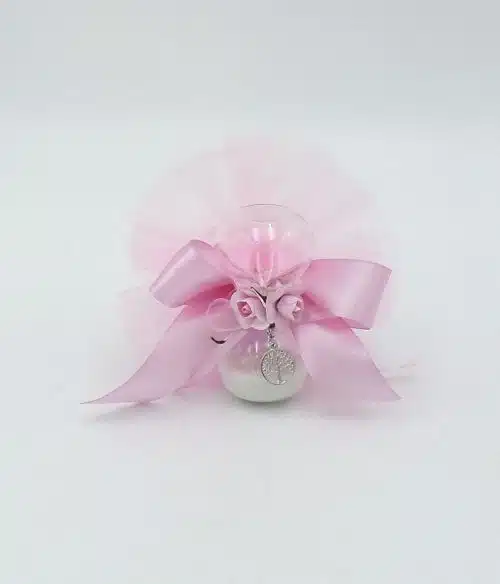 Bomboniera bimba con charm quadrifoglio e confezione rosa