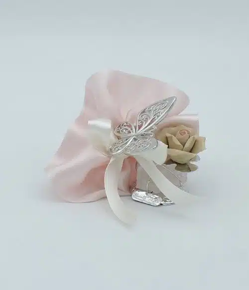 Bomboniera con farfalla su quarzo rosa e fiore in capodimonte