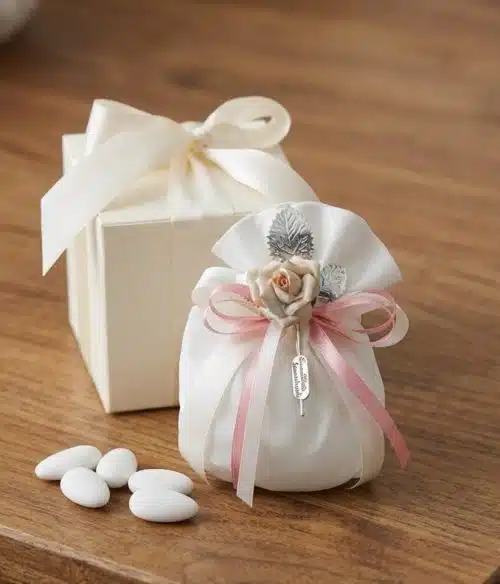 Bomboniera per comunione con rosa capodimonte e argento