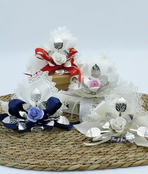 Bomboniera rosa bianca in argento artigianale con confetti