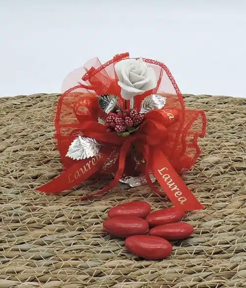 Bomboniera laurea con rosa rossa con centrino italiano
