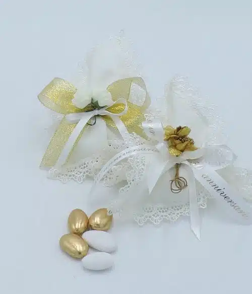 Bomboniera sacchettino con fazzoletto in pizzo per nozze oro