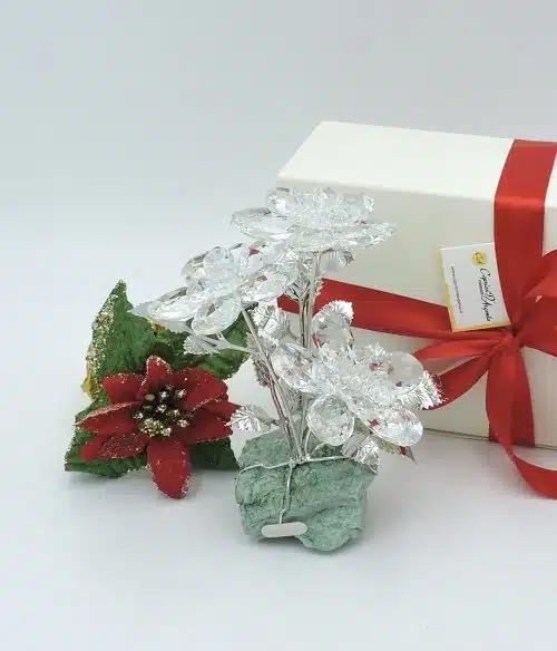 Rose bianche in argento e porcellana su quarzo rosa, realizzate a mano