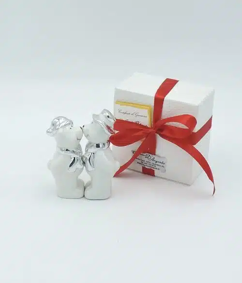 Sale e pepe con orsetti in porcellana bianca che si baciano