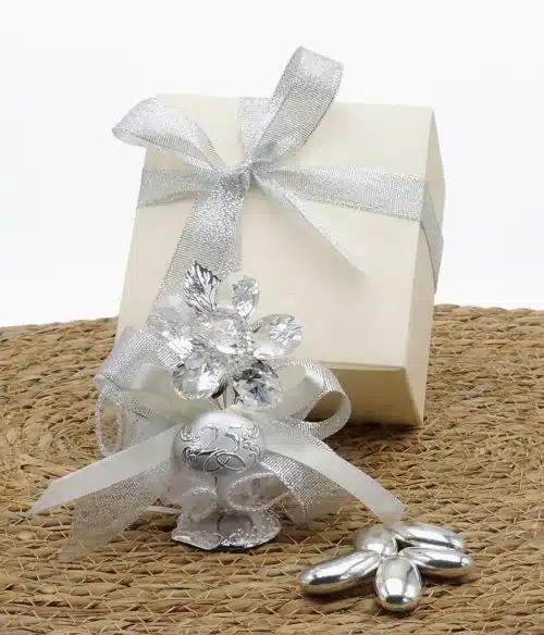 Bomboniera nozze d’argento, cestino con fiore in cristallo