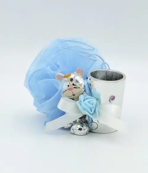 Bomboniera bambino per battesimo con gatto e portapenne