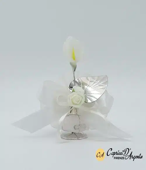 Bomboniera matrimonio con calla in vetro e argento su quarzo rosa