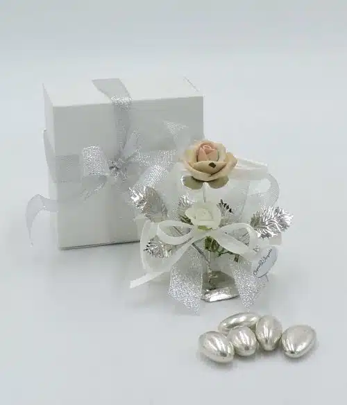 Bomboniere nozze argento con rosa in argento e porcellana