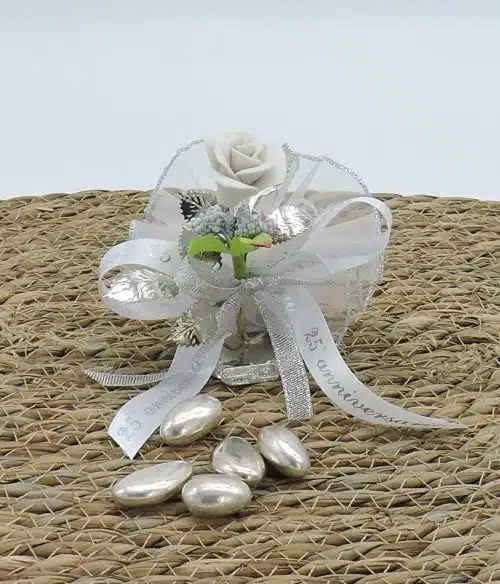 Bomboniera nozze d’argento con rosa in porcellana e confetti