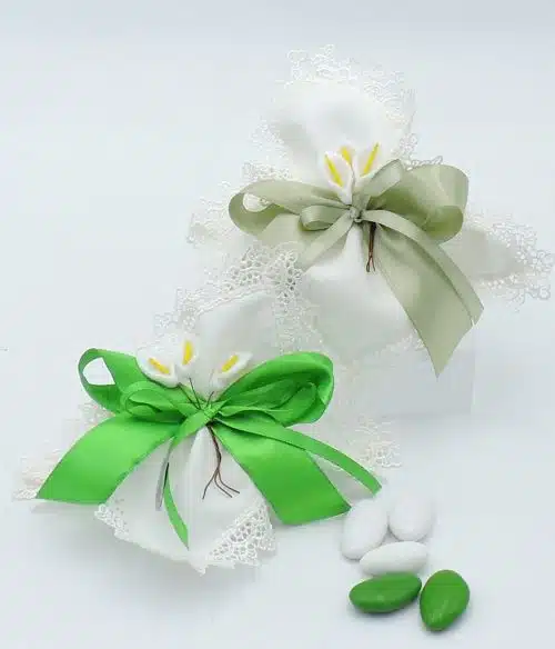 Bomboniera nozze di smeraldo con calla in argento e confetti