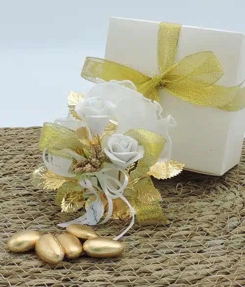 Bomboniera con rose in porcellana in bagno oro con confetti