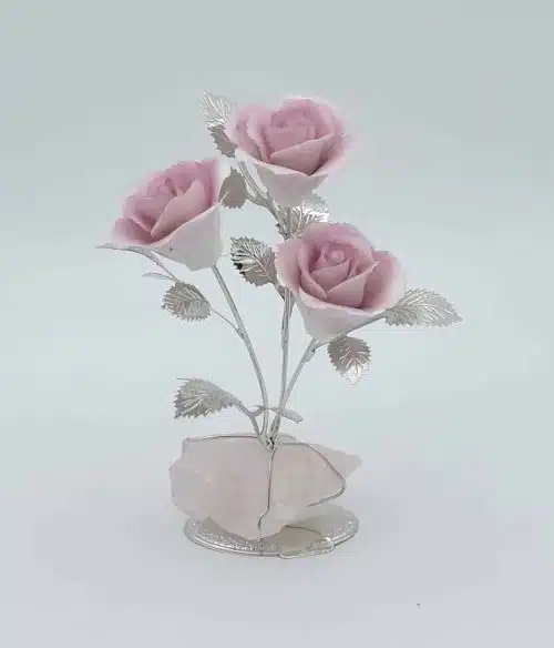 Rose color rosa in porcellana e argento su quarzo rosa, fatte a mano