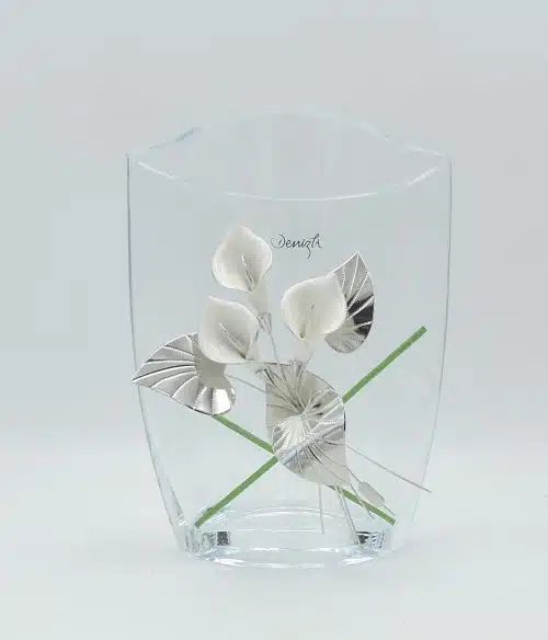 Vaso trasparente grande con fiore calla in porcellana e argento