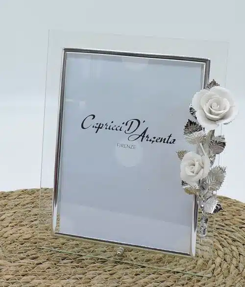 Cornice vetro con rose bianche in porcellana e argento 15×20