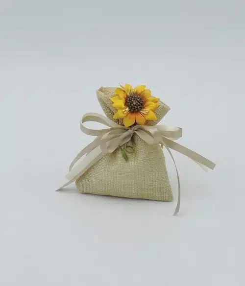 Sacchettino in juta con ottimi confetti a scelta e girasole