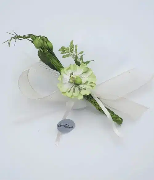 Segnaposto con rametto fiore e con confetto cioccolato mandorla