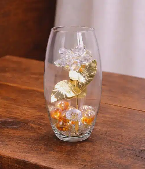 Vaso 50° anniversario con fiore in cristallo e foglie dorate