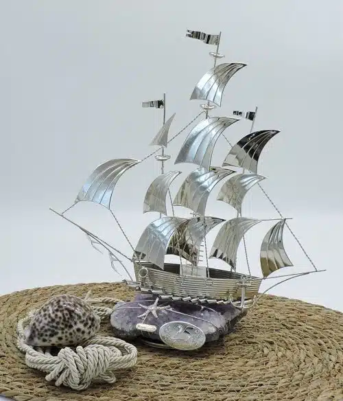 Veliero in argento su pietra minerale Ametista, realizzato a mano